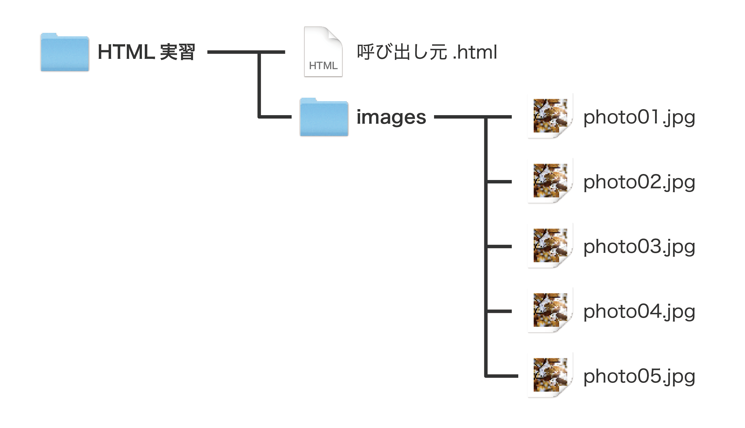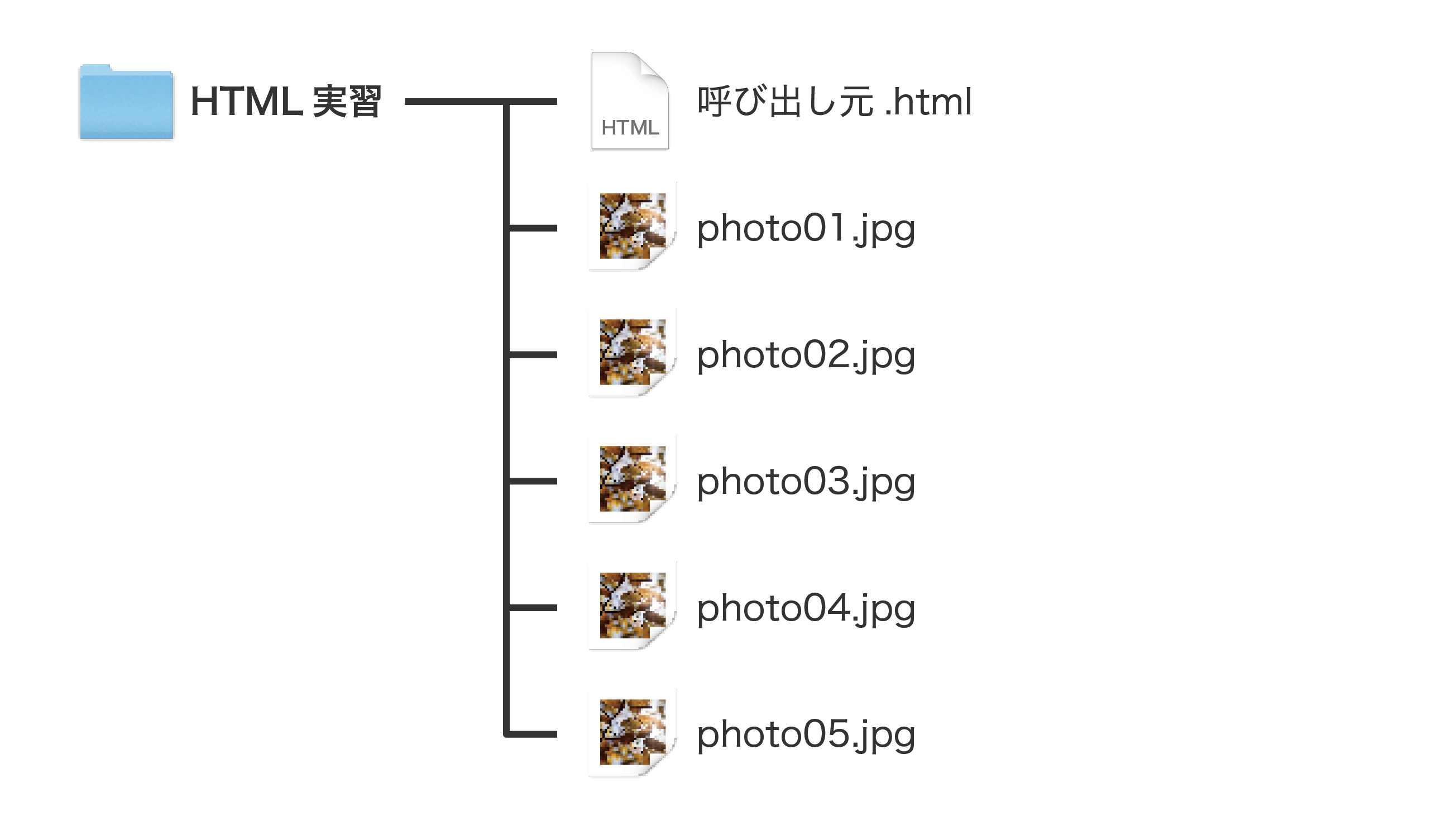呼び出し元のファイルと同一フォルダにあるファイルは、「./」のあとに続けてファイル名を記述します。例えば、同じフォルダにあるphoto01.jpgという画像を表示する場合は次のように記述します。