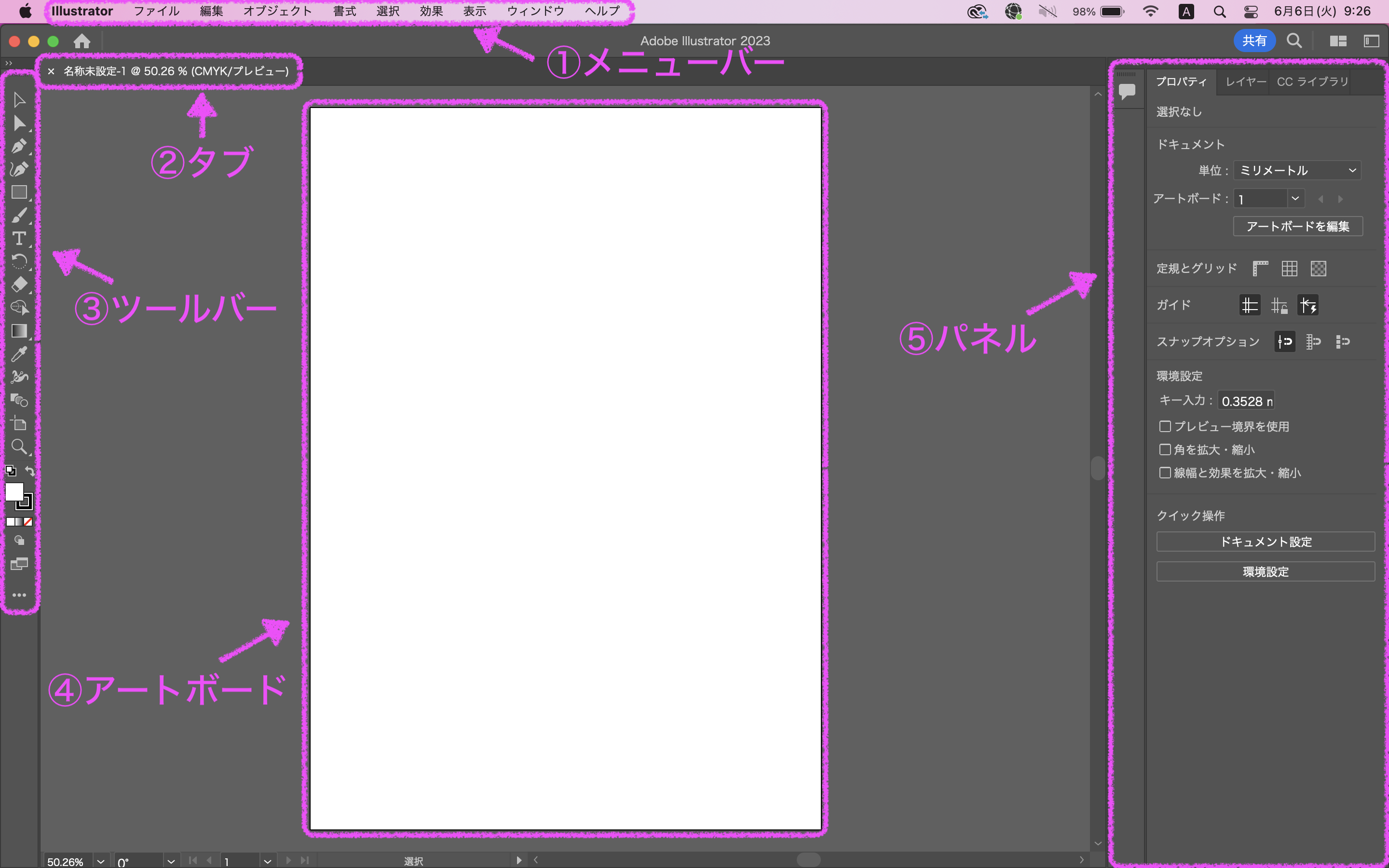 - Illustratorのさまざまな機能がメニューごとに分類されています。