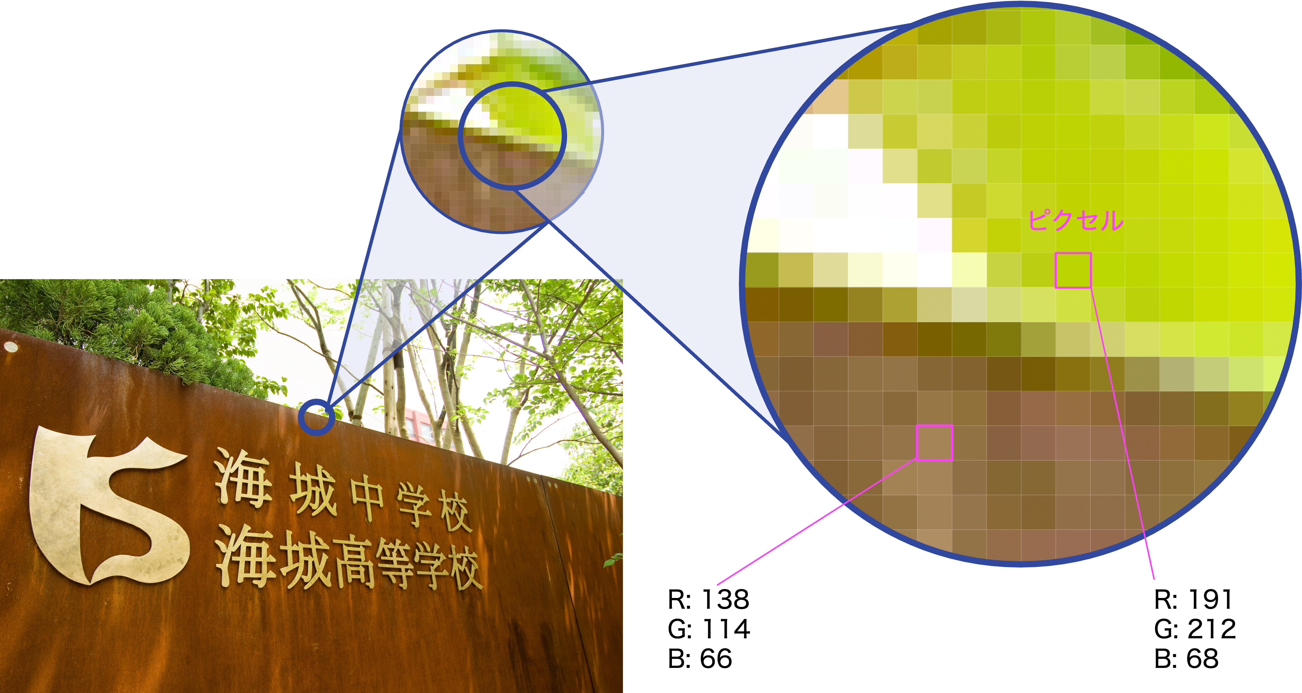 ラスタ画像とは、色のついた小さい正方形であるピクセル(画素)を大量に組み合わせた画像です。各ピクセルには、色や濃淡の情報が保存されています。ラスタ画像はペイント系ソフトウェア(Adobe Photoshop等)で作成します。ピクセル数が多いほど高画質になり、少ないほど低画質になります。拡大すると、ジャギー(ギザギザ)ができ、粗くなります。ラスタ画像は、デジタル写真やWEB画像などに用いられ、主なファイル形式はJPEG,GIF,PNGなどがあります。