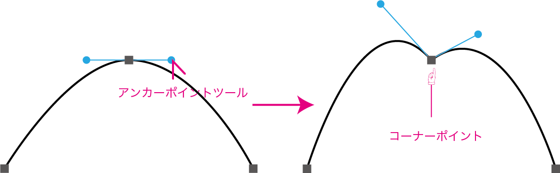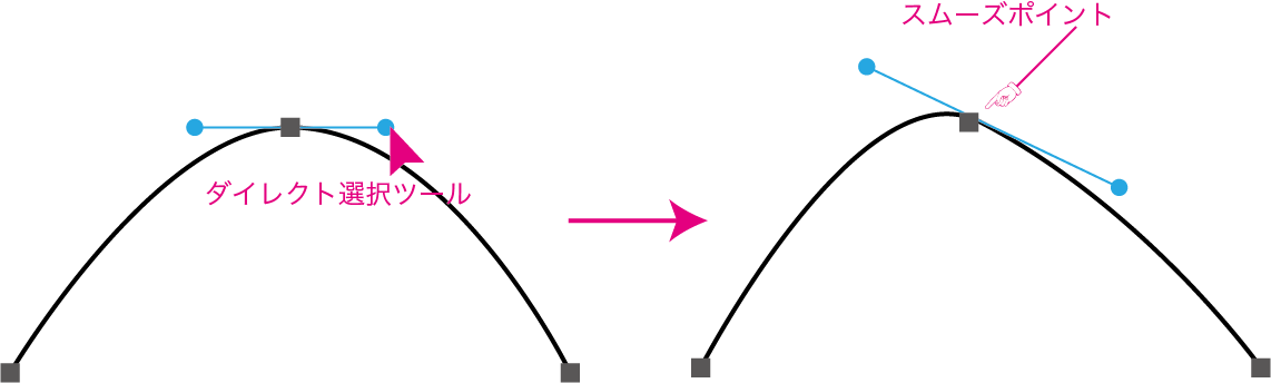 アンカーポイントツールでクリックして動かすと、スムーズポイントがコーナーポイントに換わり、左右のハンドルを別々に動かすことができます。