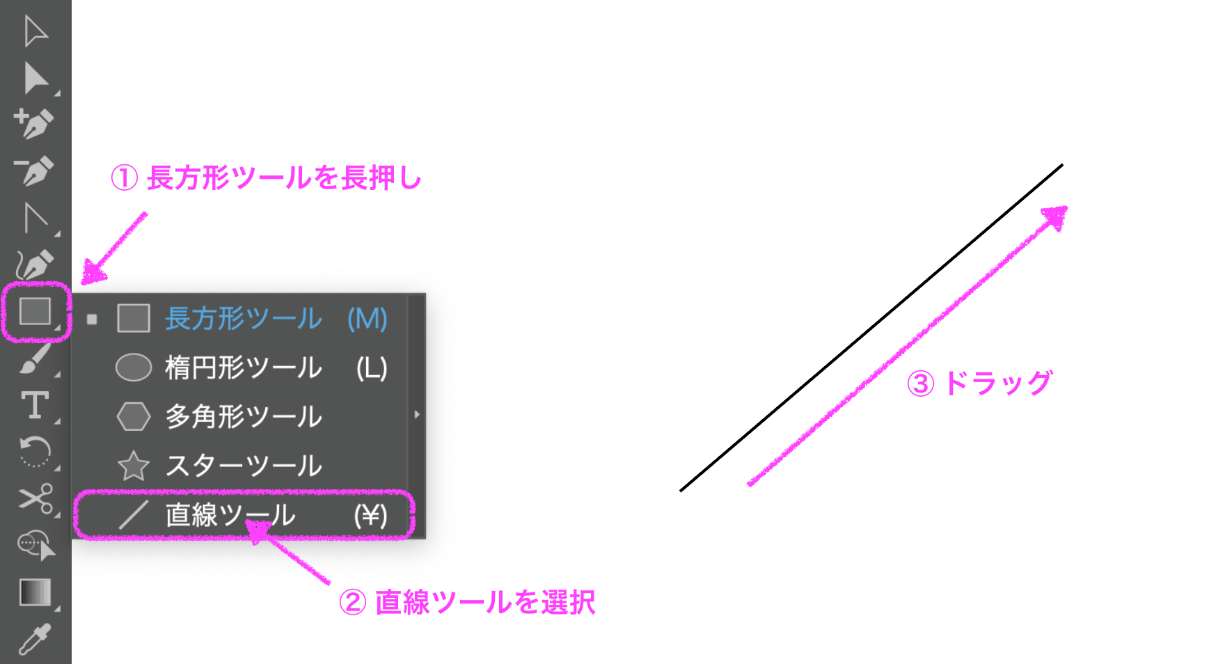 直線ツールを選択し、アートボード上でマウスをドラッグすると、ドラッグの距離と角度に応じた直線が描かれます。