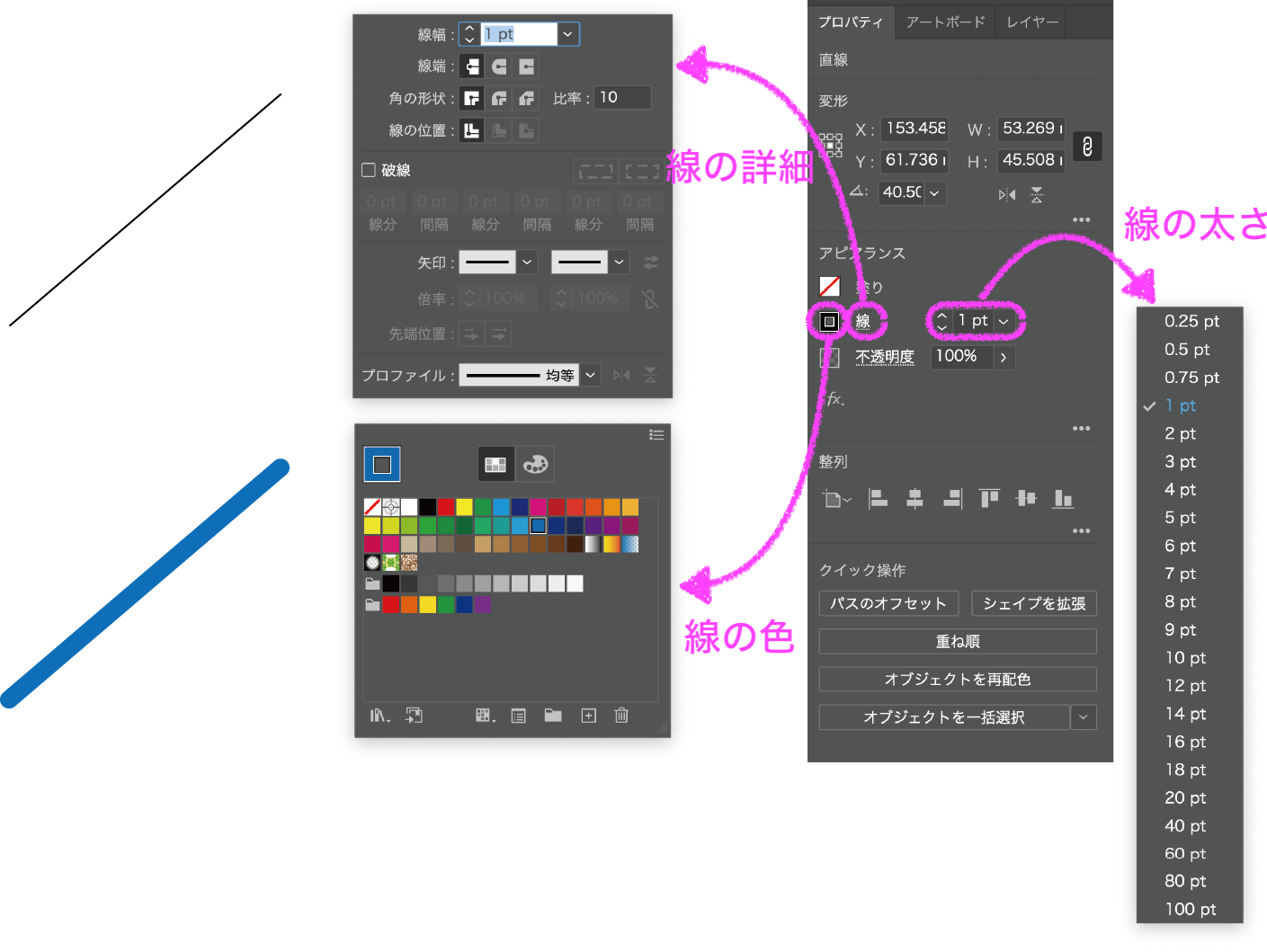 選択ツールで線を選択し、プロパティパネルから書式の設定をします。