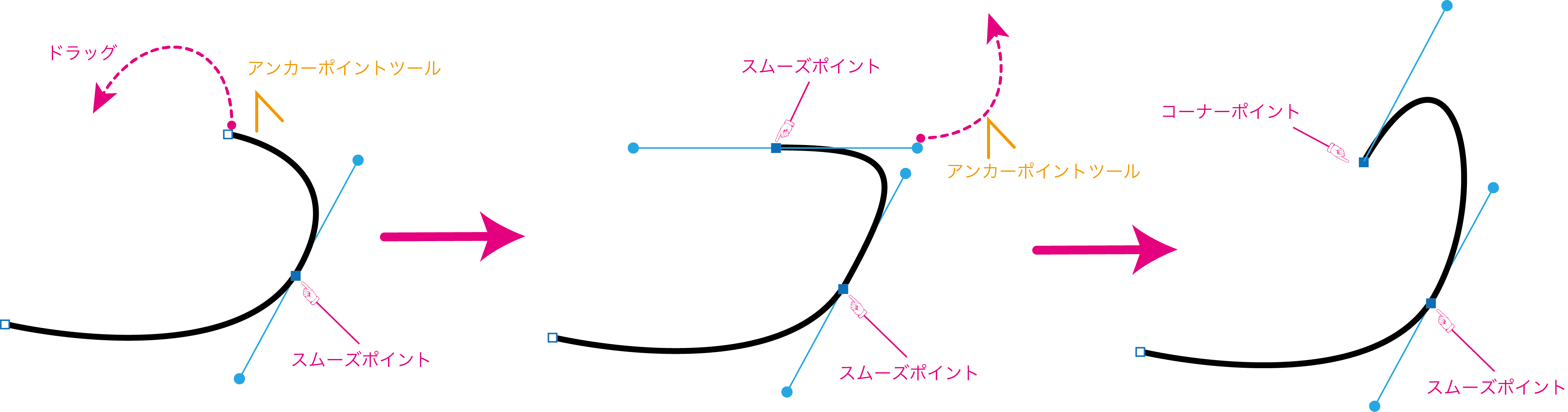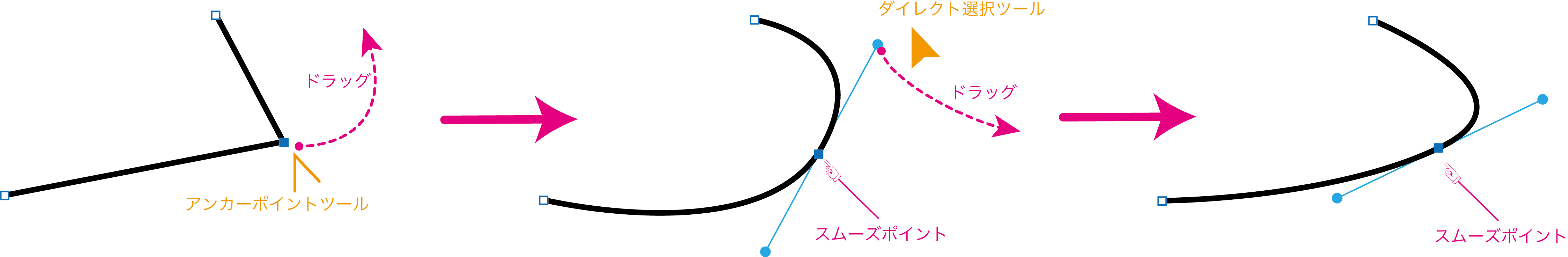 アンカーポイントツールを使って、新しいスムーズポイントの方向線からドラッグすると、末端のアンカーポイントがコーナーポイントになります。