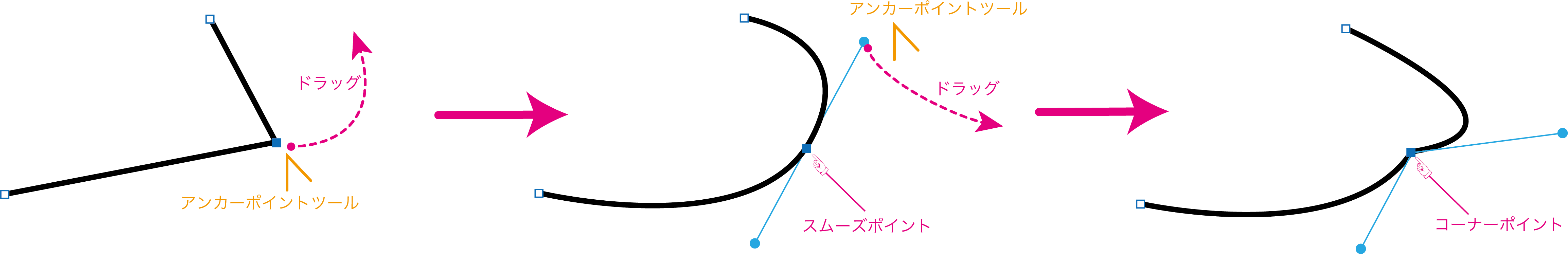 アンカーポイントには、直線間のアンカーポイントと曲線のアンカーポイントがあり、曲線のアンカーポイントはスムーズポイントとコーナーポイントの2種類があります。