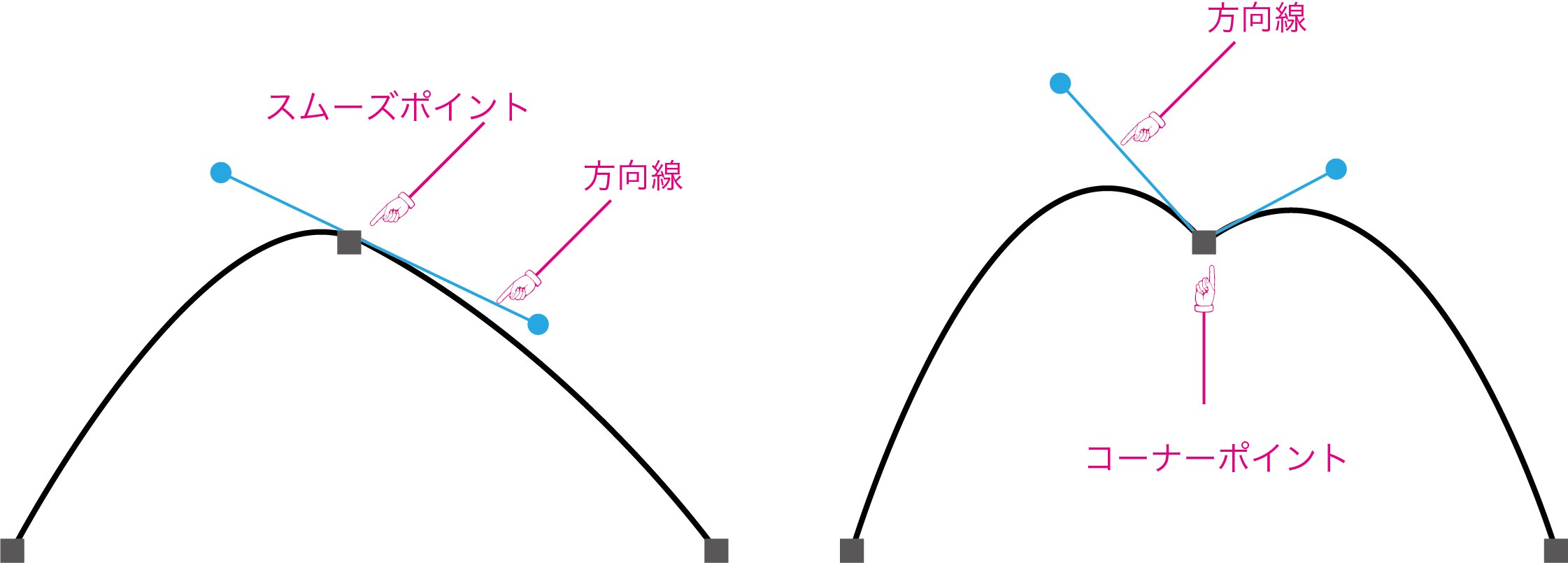 スムーズポイントはポイントから左右の方向線(ハンドル)がまっすぐ伸びていて、方向線(ハンドル)はポイントを軸に動きます。