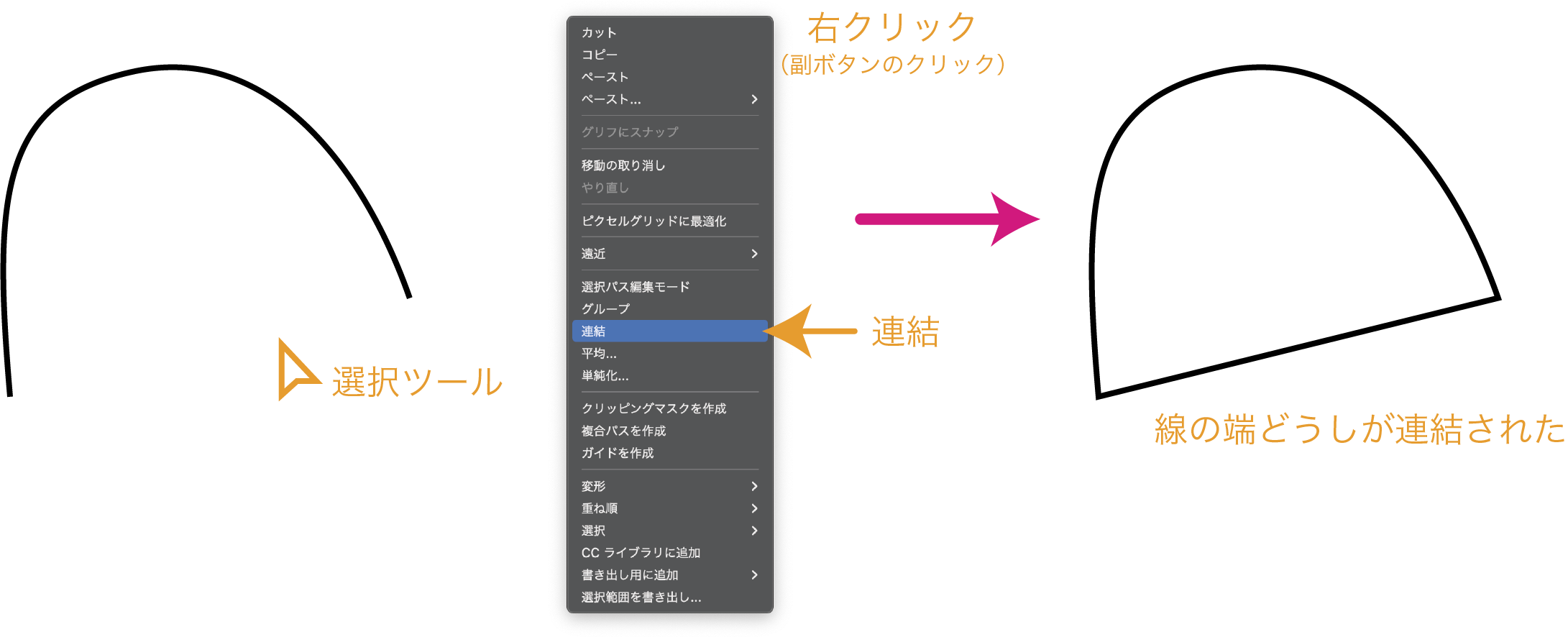 一方、コーナーポイントは左右で独立した方向線(ハンドル)を動かすことができます。末端にあるコーナーポイントからは片方の方向線(ハンドル)のみ出現します。