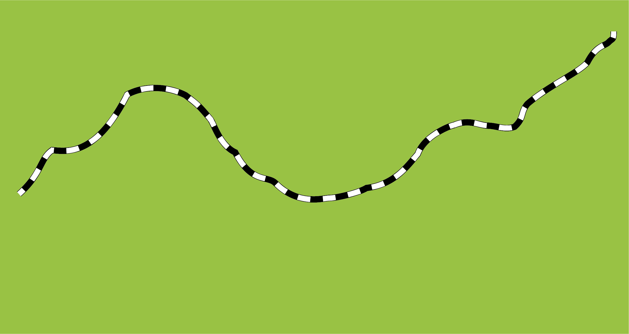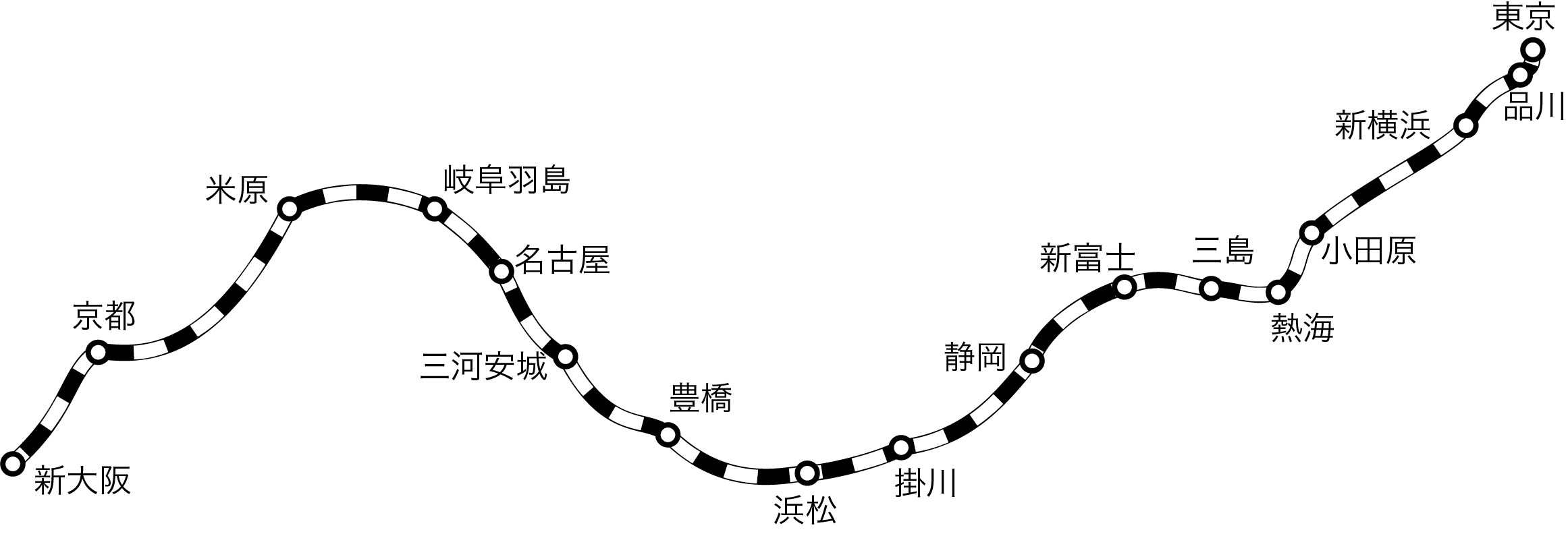 黒の実線と白の破線を重ねると、JRの線路を表す線となります。
