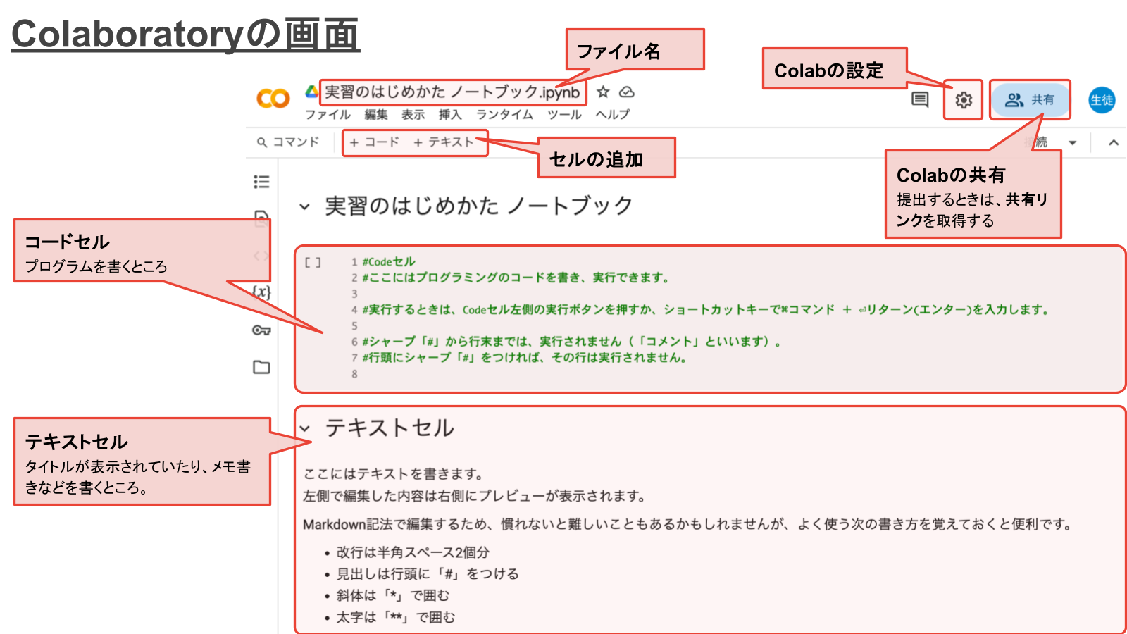実習ブロックでは、具体的なプログラムの書き方を示しています。ノートブックに書き写しながら理解を深めてください。