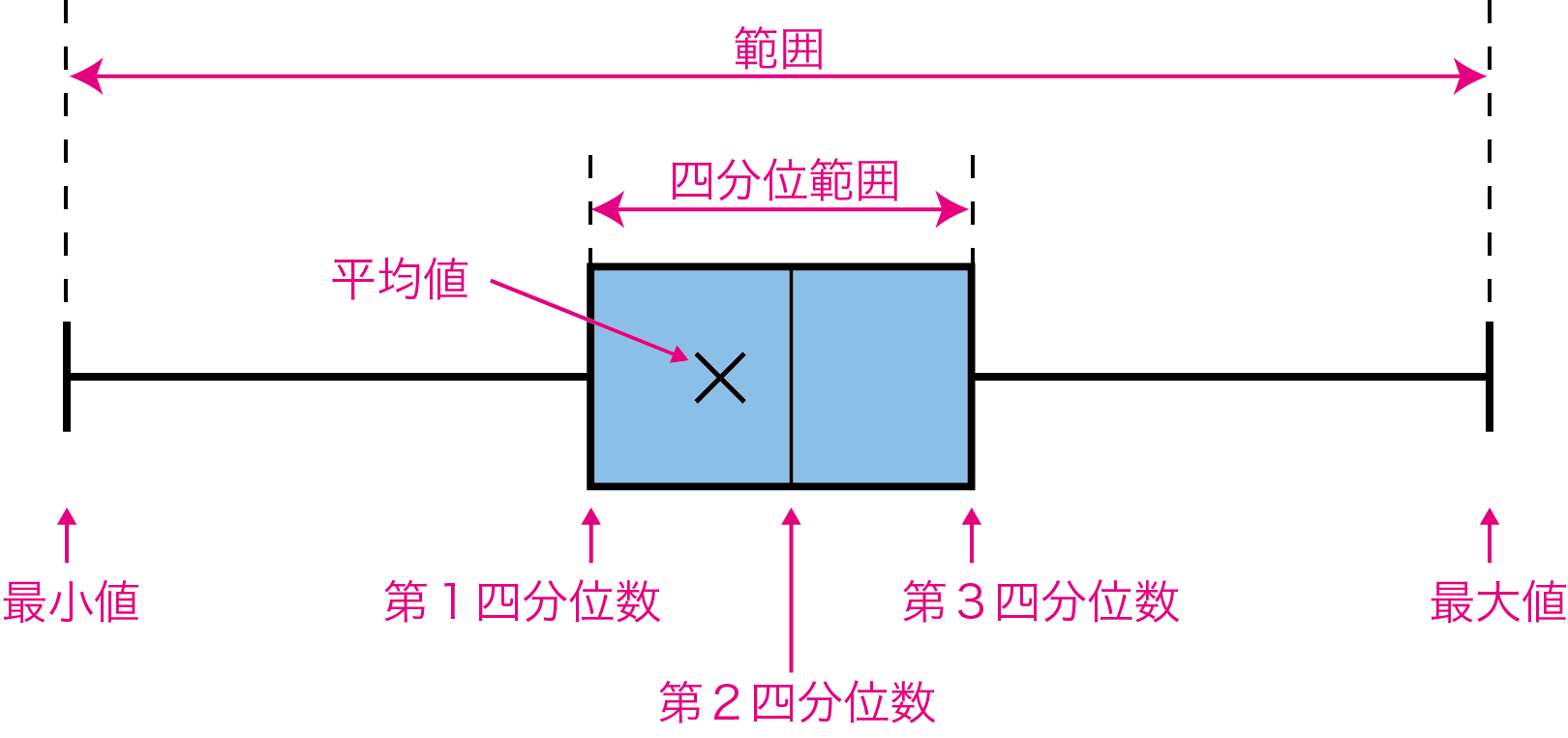 四分位数や最大値・最小値を用いることで、データの散らばりを視覚的に表した図を箱ひげ図といいます。