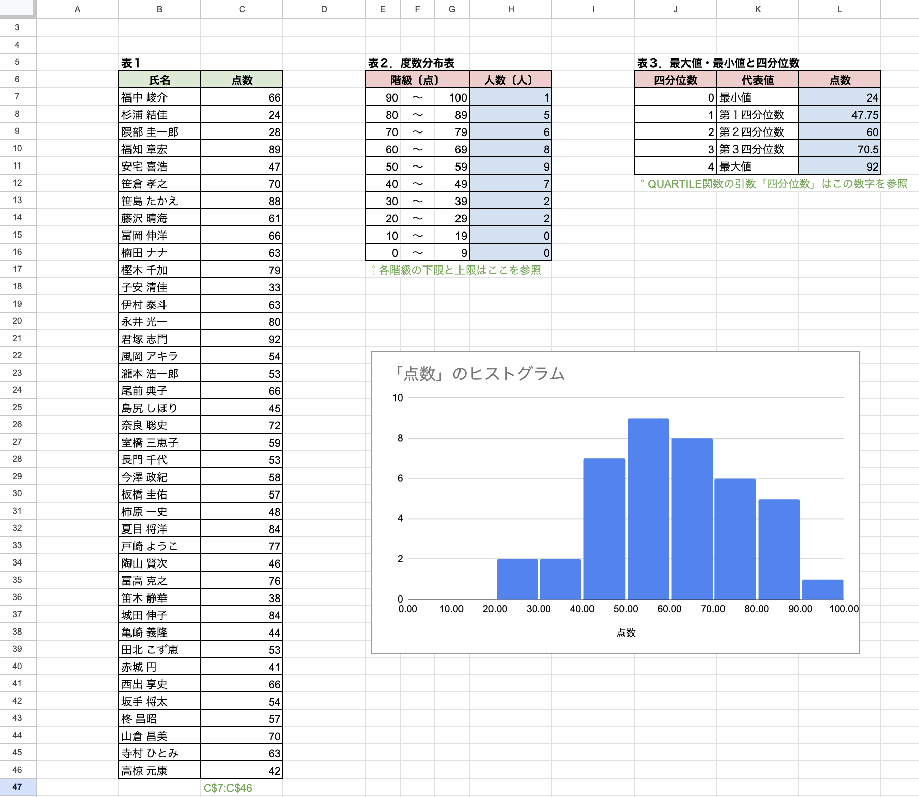 スプレッドシートで四分位数を求めるときは、次のようにQUARTILE関数を使います。