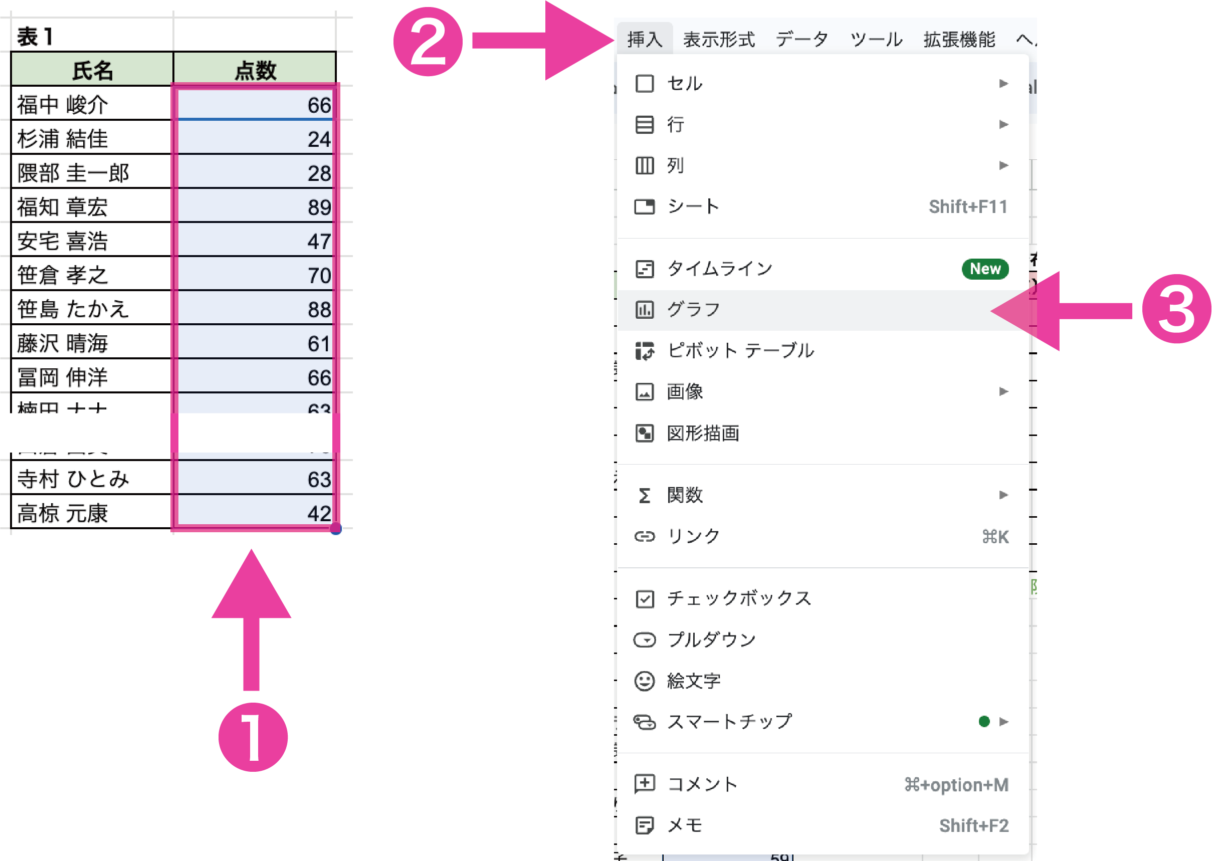 ❶表1の点数を選択した状態でメニューバーの❷挿入 > ❸グラフを選択します。