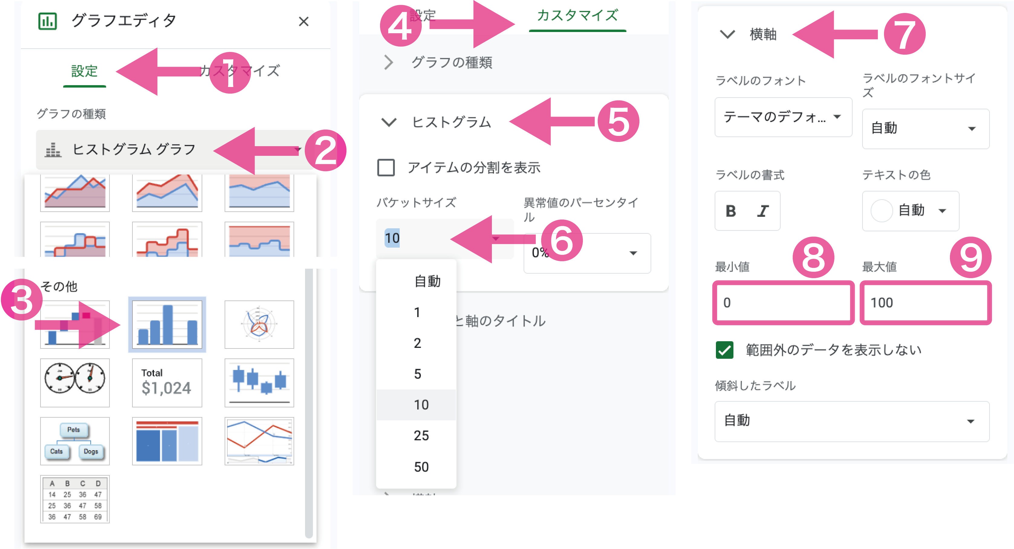 グラフエディタの❶設定から、❷グラフの種類を❸ヒストグラムにします。次に、グラフエディタの❹カスタマイズから、❺ヒストグラムを選択し、❻パケットサイズを10に変更します(パケットサイズは階級幅のことです)。また、❼横軸を選択し、❽最小値を0,❾最大値を100に変更します。