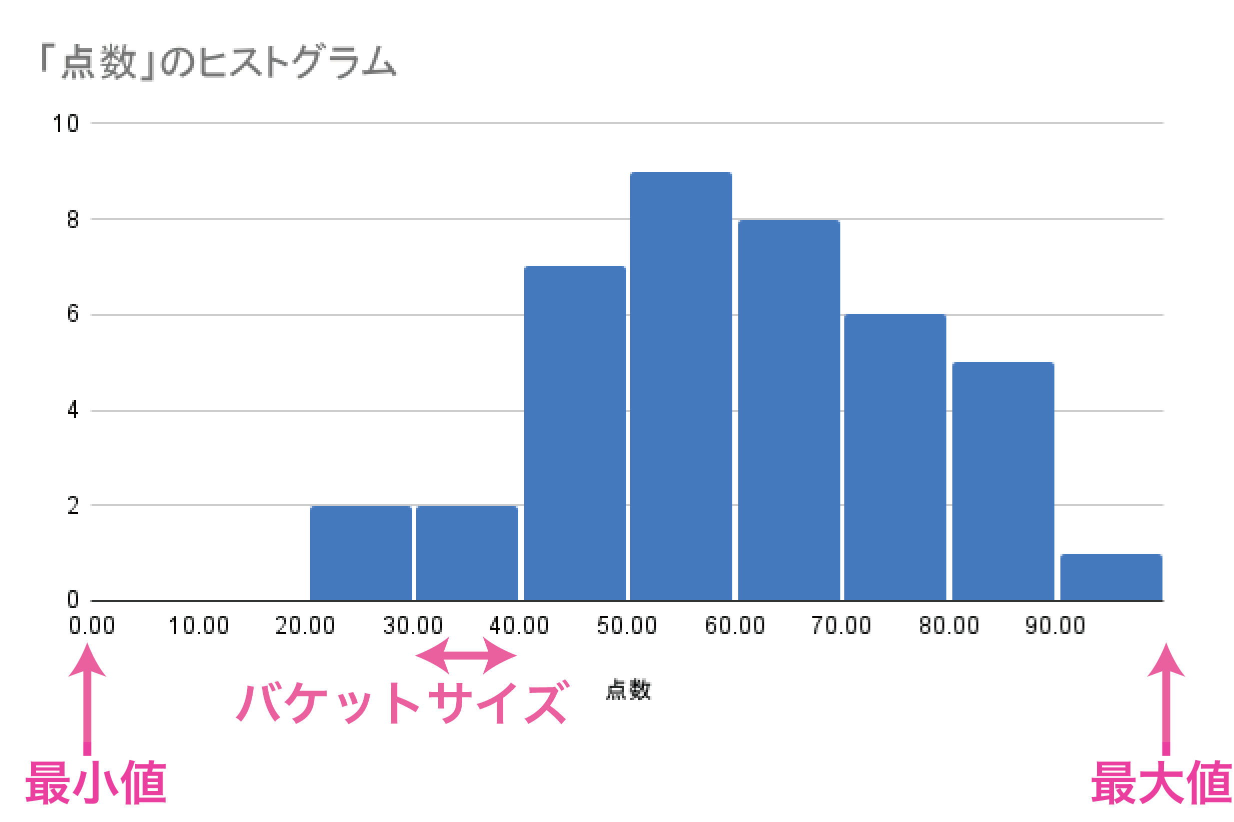 バケットサイズは階級幅、最小値と最大値は横軸の範囲を示します。
