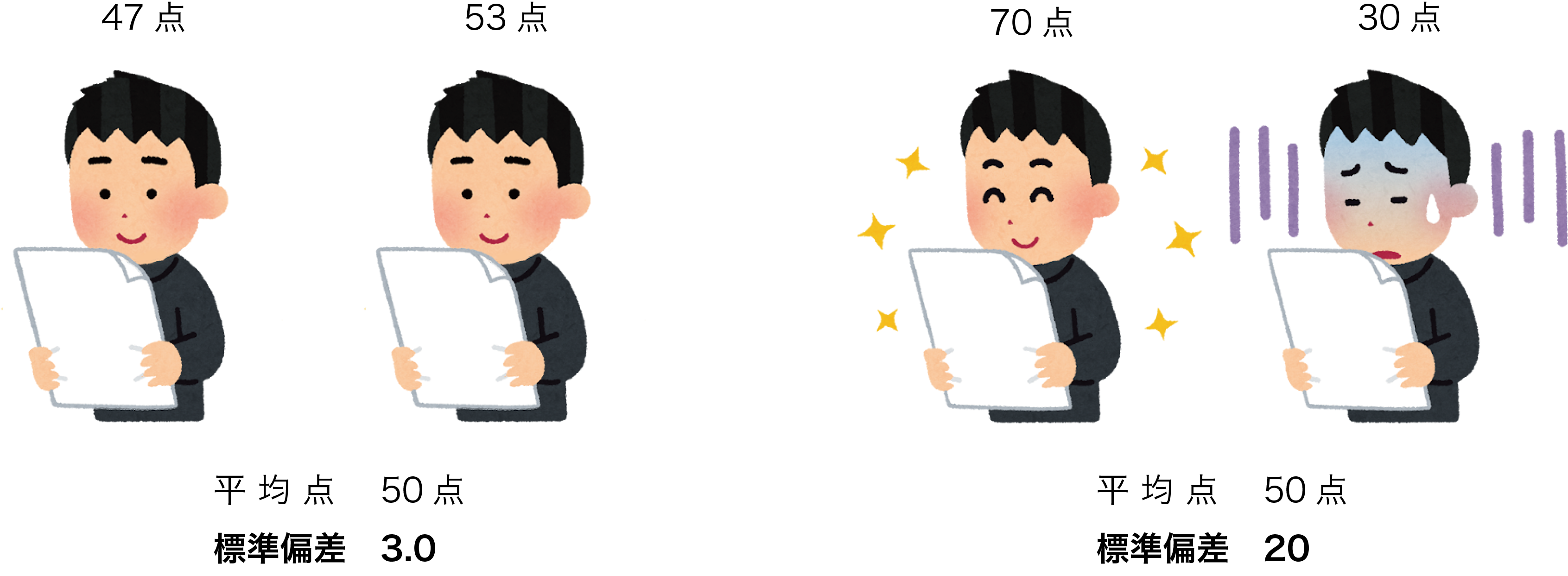 図のように、47点と53点の集団と、70点と30点の集団では、平均点は同じ50点ですが、その特徴は大きく異なります。