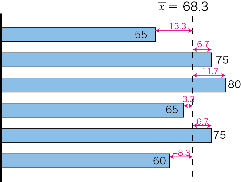 各データと平均値の差を偏差といい、$i$番目のデータ$x_i$の偏差は$x_i-\bar{x}$で表せます。